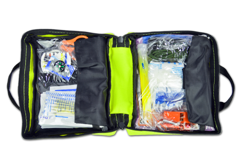 Fire Starter and Flint (1), Paracord (1), Medical Gloves (1pr), Triangle Bandage (2), Sting Relief Pads (4), Sewing Kit (1), Bandage Shears (1), Safety Pins (4), Rescue Whistle (1), Razor Blade (1), Rain Poncho (1), Moleskin Blister Relief Pad (1), Metal Tweezers (1), Glow Stick (1), Sterile Gauze Pads (3), Medical Tape 1/2″ (1 roll), Carabiner (1), LED Flashlight (1), Emergency Foil Blanket (1), Elastic Conforming Bandage (1), CPR Facemask (1), Cotton Tip Applicator (10), Compass (1), Instant Cold Compress (1), Butterfly Closure Strips (6), Antiseptic Cleansing Wipes (6), Alcohol Prep Pads (10), Standard Adhesive Bandage (25), Adhesive Knuckle Bandage (3), Adhesive Fingertip Bandage (3), Extra Large Adhesive Bandage (4), Abdominal ABD Trauma Bandage (1)